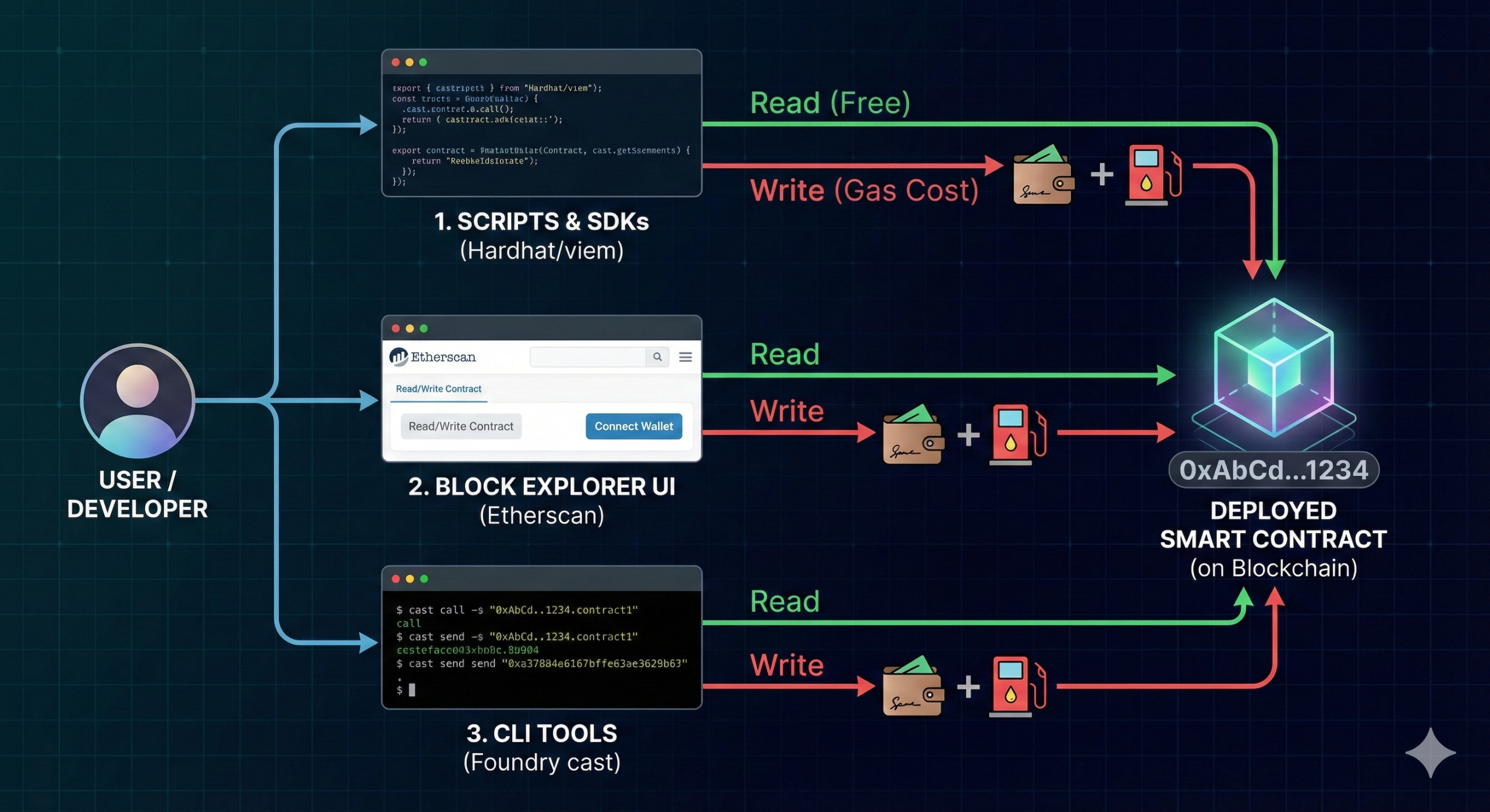 Understanding theory is not enough. Deploying a smart contract in practice requires a clear process: initializing the project, writing the contract, testing, configuring networks, writing ...