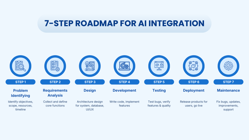 An AI integration project typically follows seven structured steps to ensure system stability and risk control.