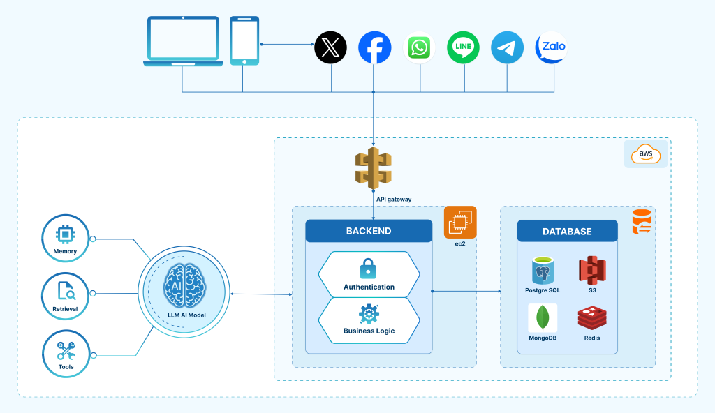 At the User Layer, customers interact through mobile apps, websites, and social platforms such as Facebook, X, WhatsApp, Zalo, or Line.