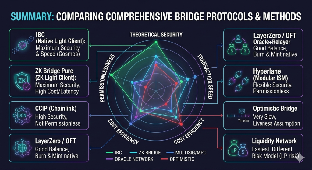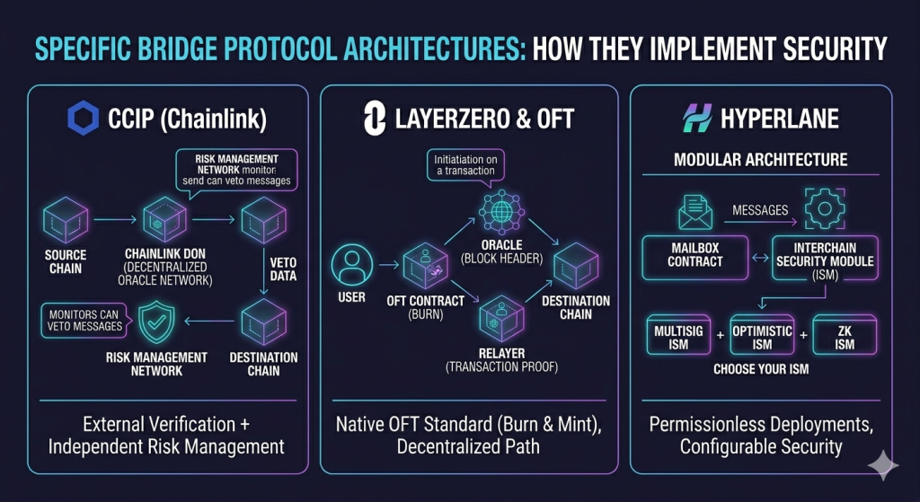 - Hyperlane is the most flexible: the same framework can have different security models depending on the selected ISM.